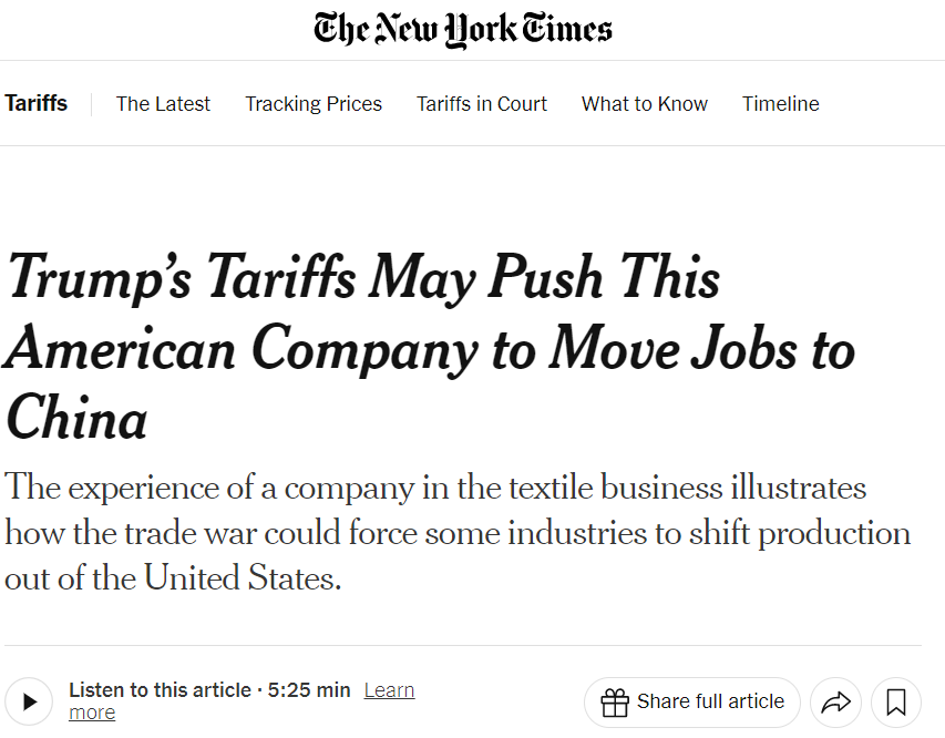 文章說,特朗普政府發(fā)起的全球貿(mào)易戰(zhàn)動搖了Cocona Labs公司的經(jīng)濟(jì)基礎(chǔ)。受到美國關(guān)稅不確定性的影響,加之中國實施的對等反制措施,這家美國公司將開始做出改變:將其核心產(chǎn)品的部分生產(chǎn)從美國轉(zhuǎn)移到中國的工廠生產(chǎn)。