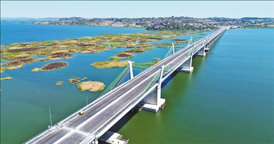 隨著坦桑尼亞總統(tǒng)哈桑揮動(dòng)國旗,示意車輛可以通行,等待駛過馬古富力大橋的首批車輛紛紛啟動(dòng)。身穿當(dāng)?shù)貍鹘y(tǒng)服飾的民眾載歌載舞,現(xiàn)場歡呼聲、歌聲、掌聲交織在一起……日前,由中國土木與中鐵十五局聯(lián)合承建的非洲最長矮塔斜拉橋——坦桑尼亞馬古富力大橋(見圖,中國土木供圖)建成通車。橫跨維多利亞湖的馬古富力大橋如一道飛虹連通兩岸,成為中非友誼新地標(biāo)。