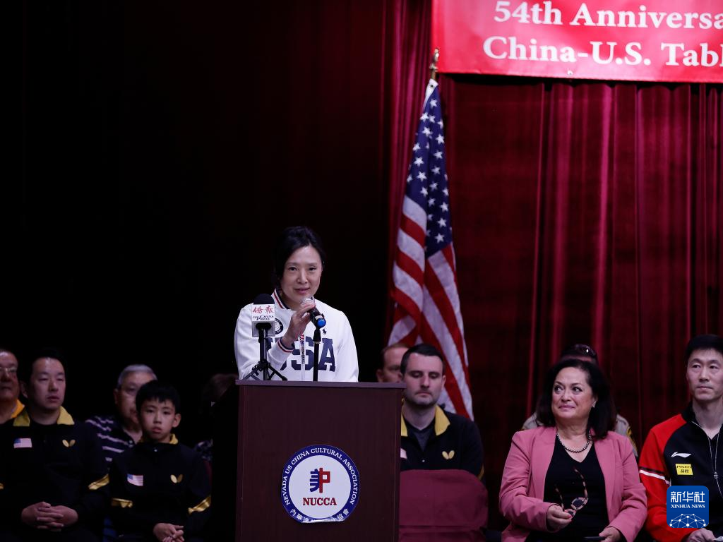 7月13日,美國乒協(xié)首席執(zhí)行官沈偉妮在美國內(nèi)華達州拉斯維加斯舉辦的紀念中美“乒乓外交”54周年暨中美乒乓球友好交流活動上致辭。新華社發(fā)(邱晨攝)