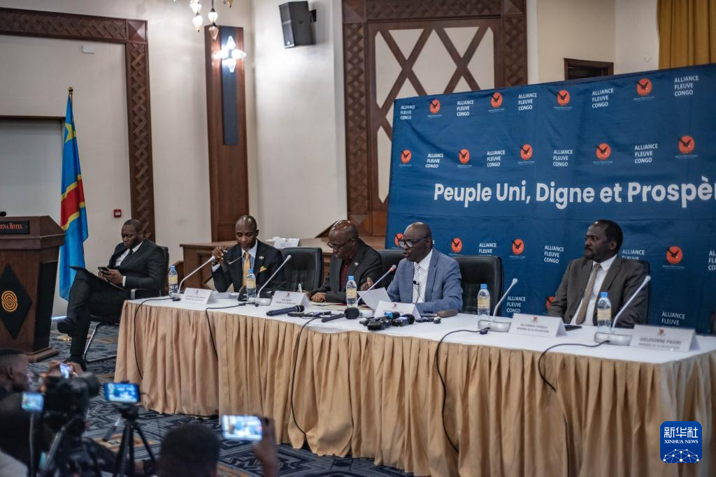 7月25日,在剛果(金)北基伍省首府戈馬市,“M23運(yùn)動(dòng)”對(duì)話代表姆博寧帕(右二)出席記者會(huì)。新華社發(fā)(扎內(nèi)姆·內(nèi)蒂·扎伊迪攝)