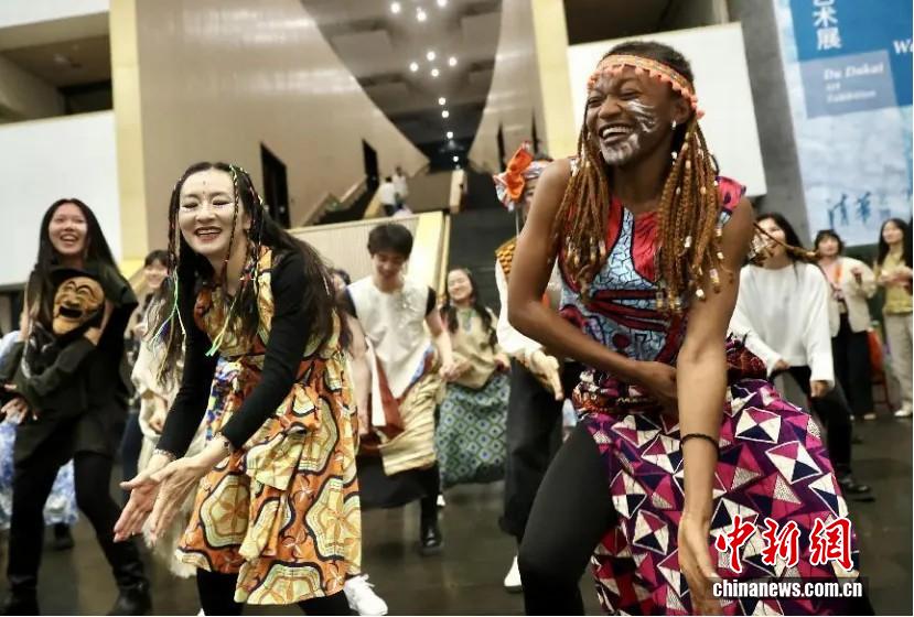 2025年4月27日,清華大學(xué)藝術(shù)博物館在北京舉辦了一場(chǎng)以非洲音樂舞蹈藝術(shù)為主題的公共教育活動(dòng)。圖為演員和觀眾一同跳舞。 中新社記者 易海菲 攝