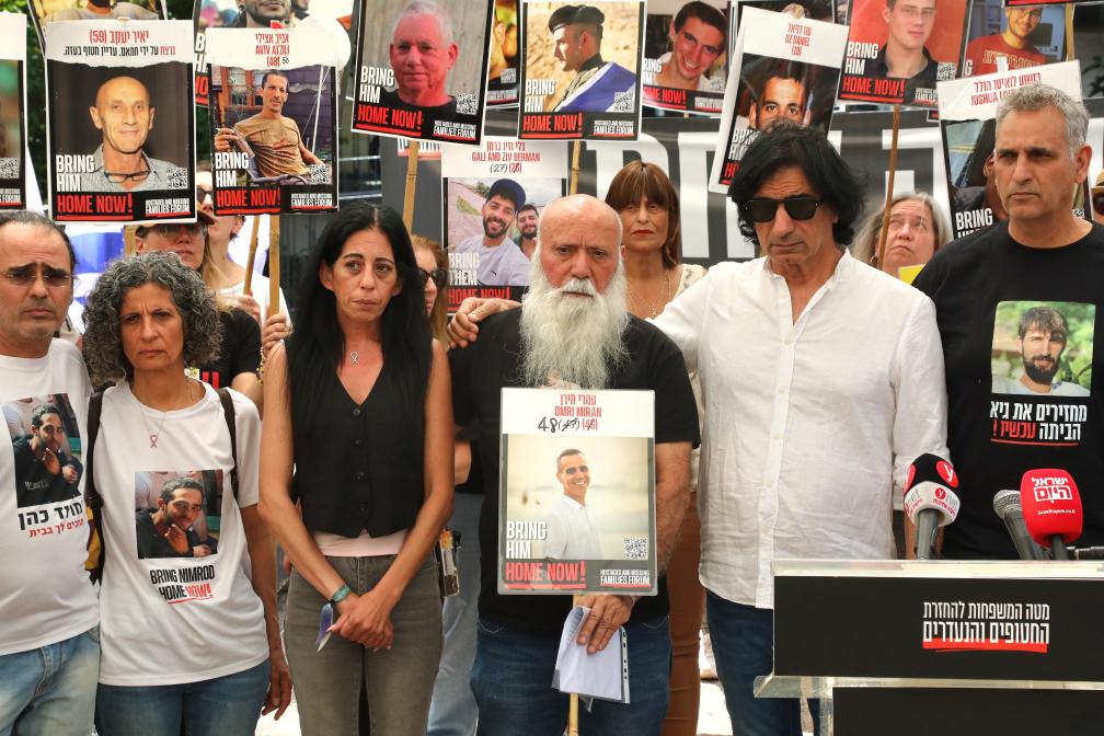 4月18日,在以色列特拉維夫的一處廣場,被扣押人員家屬舉行記者會,要求以政府推動釋放被扣押人員。新華社發(fā)(吉德翁·馬科維奇攝/基尼圖片社)