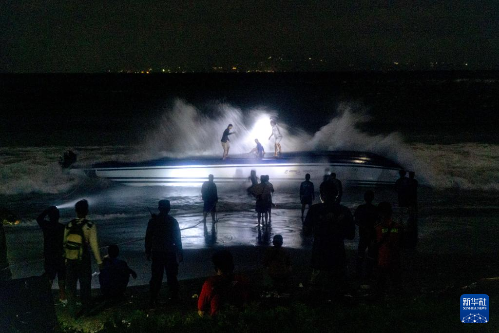 8月5日,在印度尼西亞巴厘島,工作人員將傾覆快艇拉到岸邊。新華社發(fā)(比辛拉西攝)