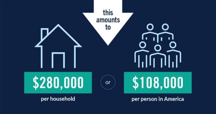 彼得森基金會給出驚人結(jié)果:如果將債務(wù)分攤給美國民眾,相當于每戶家庭負債28萬美元,每個人負債10.8萬美元。
