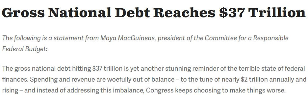 “(美國)國家債務(wù)總額達到37萬億美元的現(xiàn)實再次令人震驚地凸顯出聯(lián)邦財政的糟糕狀況。支出和收入嚴重失衡每年造成近2萬億美元的財政赤字,然而美國國會不僅沒有解決這種財政失衡,反而一直選擇讓事情變得更糟?!?/p>