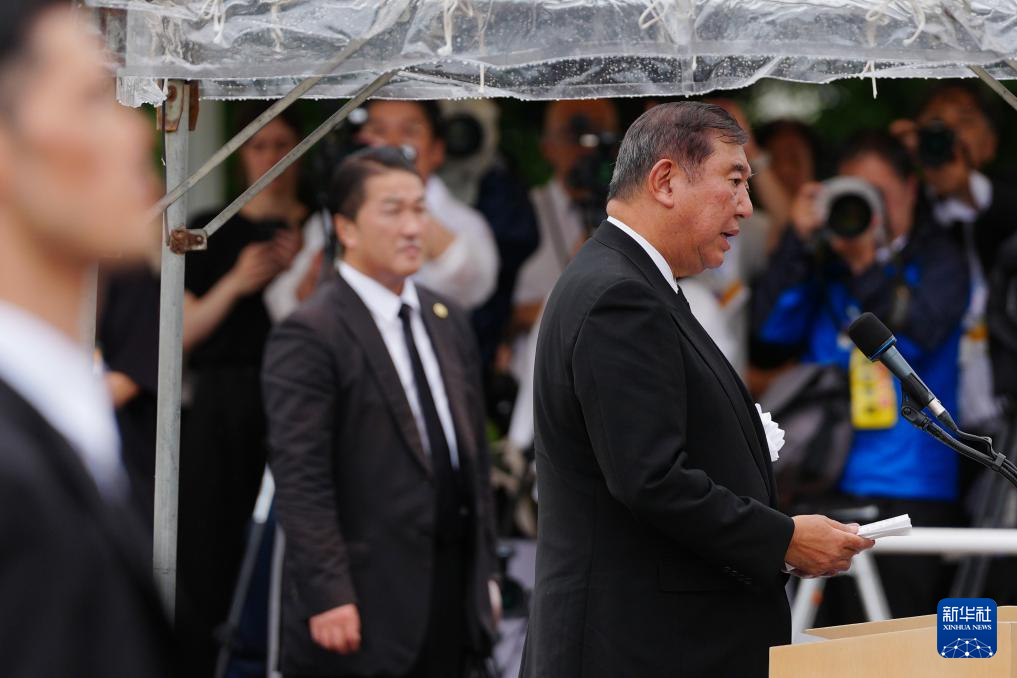 8月9日,日本首相石破茂在長(zhǎng)崎舉行的遭原子彈轟炸紀(jì)念儀式上發(fā)言。新華社記者 賈浩成 攝