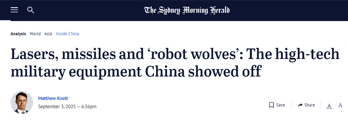 澳大利亞《悉尼先驅(qū)晨報(bào)》報(bào)道稱,中國閱兵式上展示了彈道導(dǎo)彈、激光武器、戰(zhàn)斗機(jī)、水下無人潛航器,甚至還有“機(jī)器狼”。