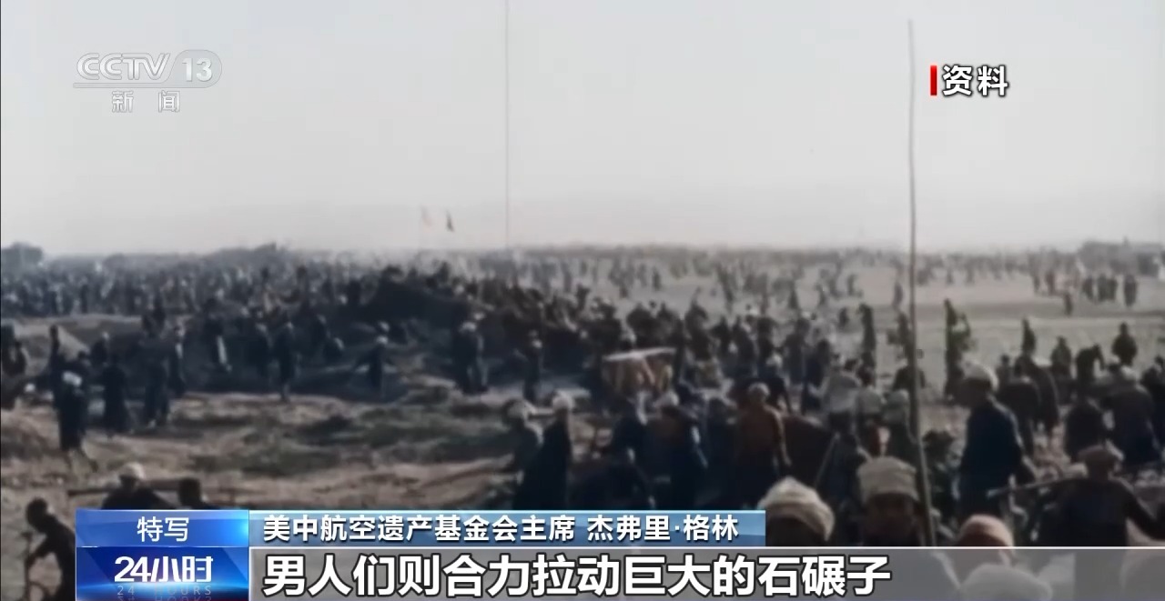美中航空遺產(chǎn)基金會主席 杰弗里·格林:婦女們背上背著孩子,坐在地上把大石塊敲成小石子;孩子們再把小石子撿到指定地點;男人們則合力拉動巨大的石碾子,有時候要100個人才能拉動一臺10噸重的石碾子,就為了把跑道壓平整。無論是寒冬還是酷暑,婦女們敲碎的每一塊石頭,都是在為機場出力,為飛機起降創(chuàng)造條件,讓美國飛行員能順利升空抗擊日軍。這背后是一種信念:他們所做的一切都在為勝利搭建基礎(chǔ)。