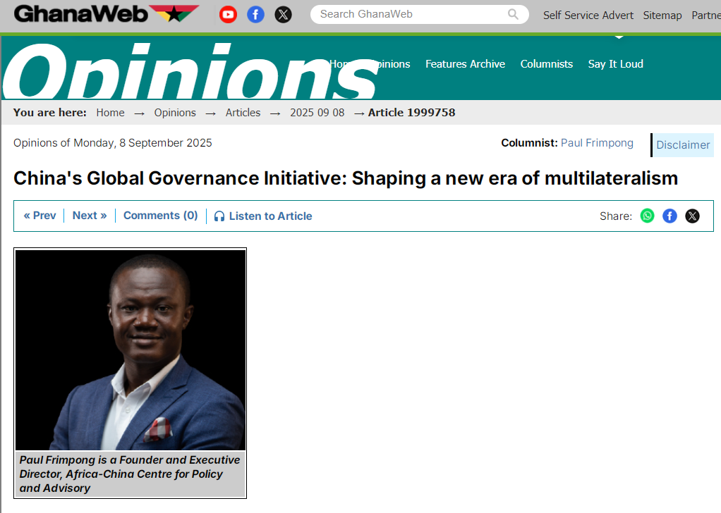 加納新聞網站“Ghana Web”9月8日刊發(fā)加納非中政策咨詢中心執(zhí)行主任保羅·弗林蓬的署名文章《中國全球治理倡議:塑造多邊主義新時代》,對中國提出的全球治理倡議予以高度評價。