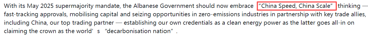 文章說,澳大利亞政府近期也公布了2035年減排目標(biāo)。澳大利亞能源部長克里斯·鮑文推出的35億澳元“家庭電池補貼計劃”已安裝超6萬套儲能系統(tǒng),證明政策驅(qū)動的轉(zhuǎn)型潛力。分析認(rèn)為,澳大利亞政府應(yīng)借鑒“中國速度”,加快審批流程、撬動民營資本,并在零碳產(chǎn)業(yè)領(lǐng)域深化與最大貿(mào)易伙伴——中國的合作,以確立澳大利亞在清潔能源領(lǐng)域的競爭力。