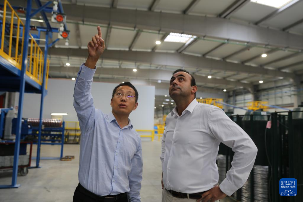 10月3日,在葡萄牙北部奧瓦爾市,亨通集團(tuán)駐葡萄牙的設(shè)備經(jīng)理劉建龍(左)與阿爾科夫雷電纜廠首席運(yùn)營官卡洛斯·格蘭雅討論技術(shù)問題。新華社記者荀偉攝