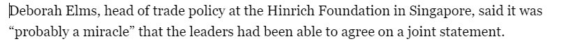半島電視臺也關(guān)注了此次峰會,報道援引新加坡欣里奇基金會貿(mào)易政策負(fù)責(zé)人黛博拉 埃爾姆斯的話說,各成員領(lǐng)導(dǎo)人能夠就聯(lián)合聲明達(dá)成一致是“了不起的事情”。他說,鑒于亞太經(jīng)合組織經(jīng)濟體的不同立場,要將任何達(dá)成一致的措辭寫入文件都是一項“充滿挑戰(zhàn)的工作”。