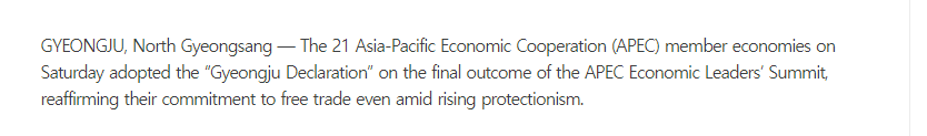 韓國《中央日報》報道稱,《慶州宣言》反映出此次APEC領(lǐng)導(dǎo)人峰會的最終成果,并重申了在保護(hù)主義抬頭 的背景下,各成員領(lǐng)導(dǎo)人對自由貿(mào)易的承諾。