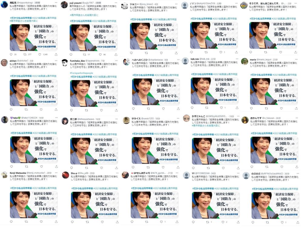 日本網(wǎng)民分享的圖片顯示,有大量不同賬號(hào)發(fā)表了支持高市的相似帖文,文字內(nèi)容幾乎一模一樣,圖片也是用的同一張宣傳海報(bào)。