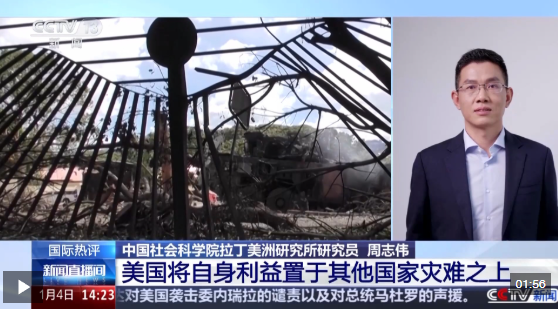 中國(guó)社會(huì)科學(xué)院拉丁美洲研究所研究員 周志偉:從這次行動(dòng)的實(shí)質(zhì)來看的話,體現(xiàn)出美國(guó)霸權(quán)行徑挑戰(zhàn)國(guó)際法,挑戰(zhàn)國(guó)際關(guān)系的準(zhǔn)則,將美國(guó)的利益置于其他國(guó)家的災(zāi)難之上。我覺得這件事是對(duì)國(guó)際法的野蠻踐踏,將進(jìn)一步加劇國(guó)際社會(huì)對(duì)于美國(guó)的不信任感。