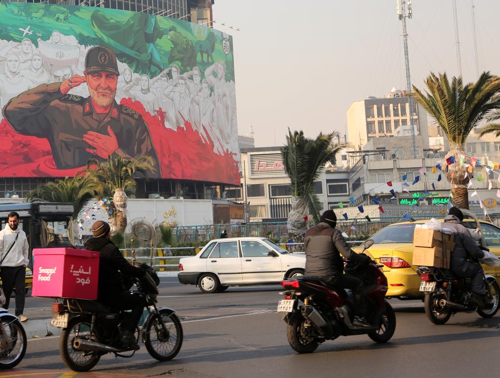 2026年1月6日,在伊朗首都德黑蘭街頭,車輛經(jīng)過一幅繪有伊遇襲身亡的高級(jí)將領(lǐng)卡西姆·蘇萊曼尼形象的宣傳海報(bào)。新華社發(fā)