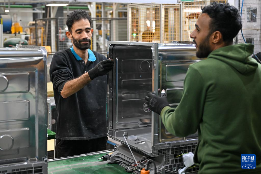 1月19日,在埃及蘇赫奈泉的中?!ぬ┻_(dá)蘇伊士經(jīng)貿(mào)合作區(qū),埃及員工在美的埃及廚房和熱水器有限公司洗碗機(jī)生產(chǎn)車(chē)間組裝洗碗機(jī)。新華社記者 辛夢(mèng)晨 攝