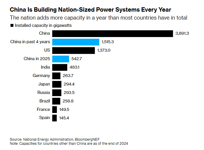 文章援引中國國家能源局日前公布的數(shù)據(jù),2025年,中國各類技術新增發(fā)電裝機容量達到543吉瓦(GW)。這一數(shù)字比截至2024年底印度全國所有發(fā)電廠的總容量還要高出12%。自2021年底以來,中國新增的發(fā)電容量也已超過整個美國電力系統(tǒng)的總量。