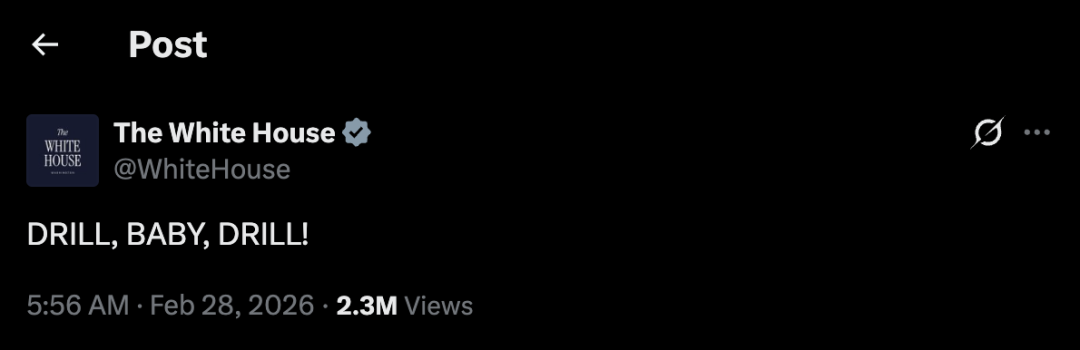 2月28日,美國(guó)和以色列宣布,對(duì)伊朗發(fā)動(dòng)聯(lián)合軍事行動(dòng)。同時(shí),白宮的社交媒體賬號(hào)更新了一條動(dòng)態(tài),只有簡(jiǎn)短的一句話: