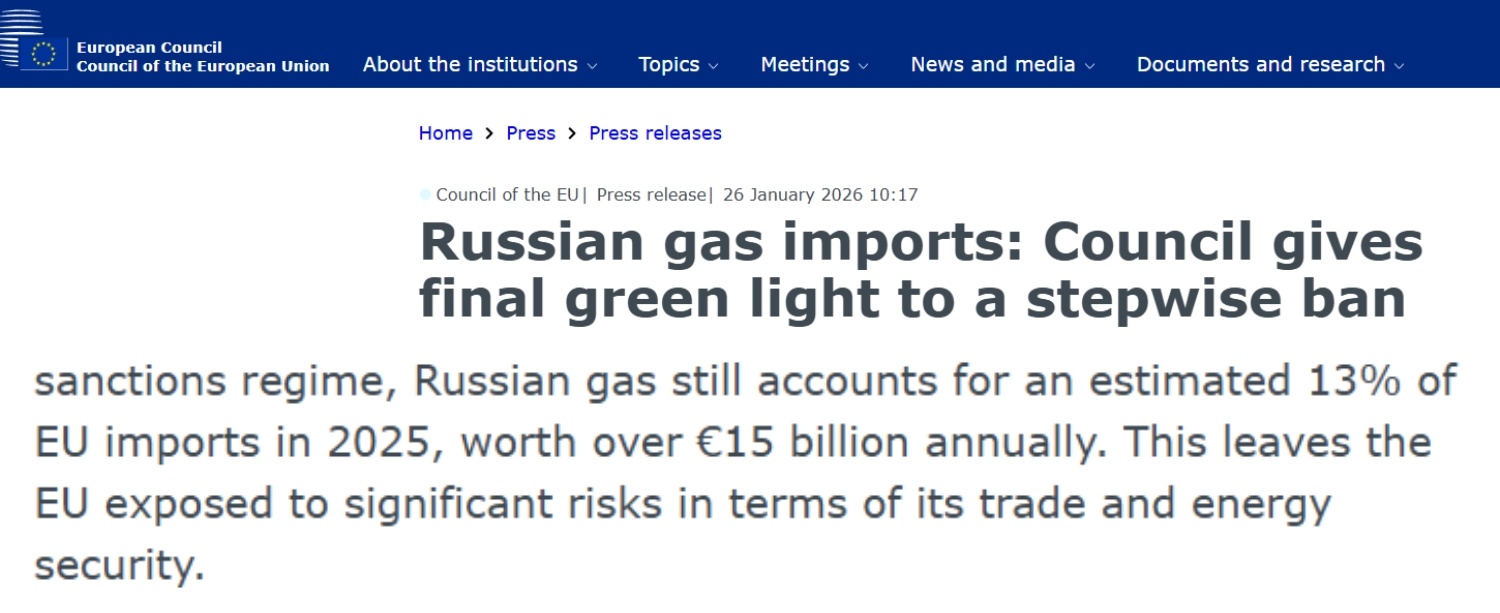 歐盟27個(gè)成員國1月26日正式通過關(guān)于逐步禁止從俄進(jìn)口管道天然氣和液化天然氣的法規(guī)。對(duì)從俄進(jìn)口液化天然氣的全面禁令將于2027年年初生效,對(duì)進(jìn)口管道天然氣的全面禁令將于2027年秋季生效。2025年,俄天然氣約占?xì)W盟進(jìn)口總量的13%,價(jià)值超過150億歐元。