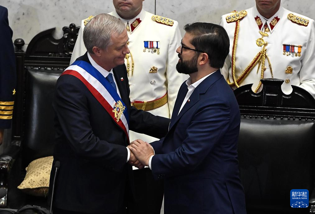 3月11日,在設(shè)于智利第二大城市瓦爾帕萊索的國民議會(huì),智利總統(tǒng)何塞·安東尼奧·卡斯特(左)在總統(tǒng)權(quán)力交接儀式上與卸任總統(tǒng)博里奇握手。新華社/智利一號(hào)通訊社