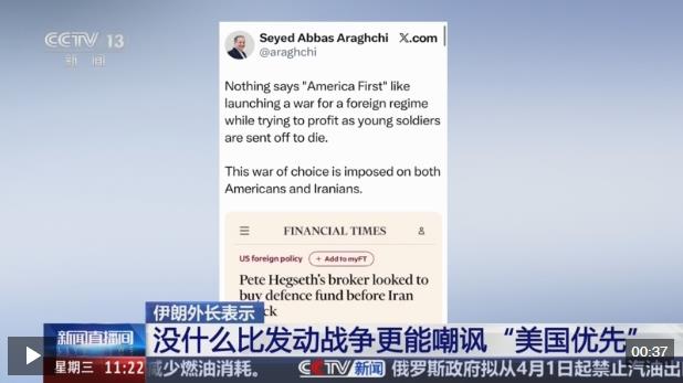 對(duì)于美國國防部長赫格塞思的投資經(jīng)紀(jì)人曾在美以對(duì)伊朗發(fā)起軍事打擊前,嘗試投資防務(wù)類基金一事,伊朗外交部長阿拉格齊3月31日在社交媒體發(fā)文說,沒有什么比為一個(gè)外國政權(quán)發(fā)動(dòng)戰(zhàn)爭(zhēng)、并從被派往前線的年輕士兵之死中牟取暴利,更能嘲諷“美國優(yōu)先”口號(hào)的了。