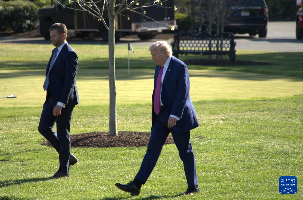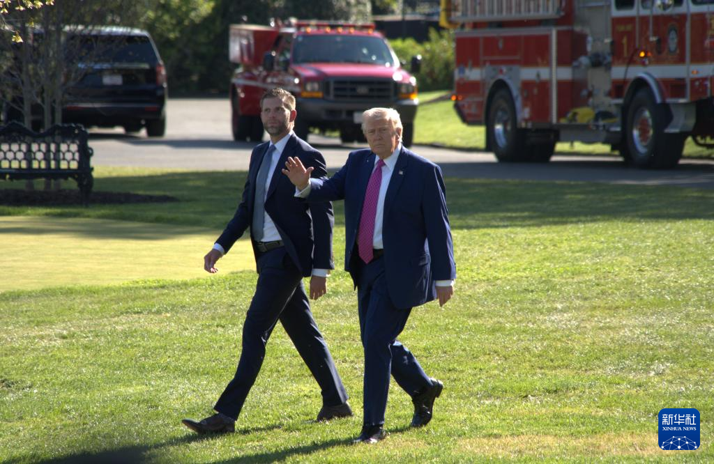 4月10日,美國總統(tǒng)特朗普(右)準備乘直升機離開華盛頓白宮。新華社發(fā)(李源清攝)