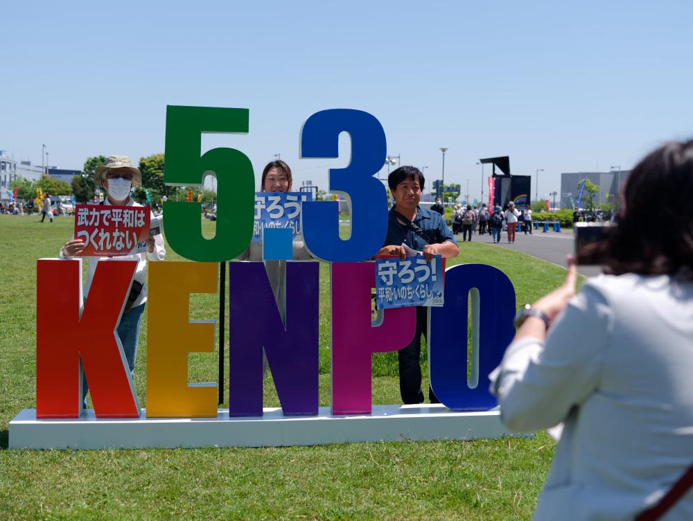 2024年5月3日,在日本東京有明防災(zāi)公園,人們舉著標(biāo)語與憲法大集會的標(biāo)識合影。當(dāng)日,3萬余名日本民眾聚集在東京有明防災(zāi)公園的廣場上,高喊“守護(hù)憲法、守護(hù)和平”的口號,舉行了聲勢浩大的護(hù)憲集會。新華社記者 張笑宇 攝