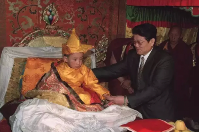 圖為第十一世班禪在國務院代表、國務委員李鐵映照護下坐床 來源:新華社