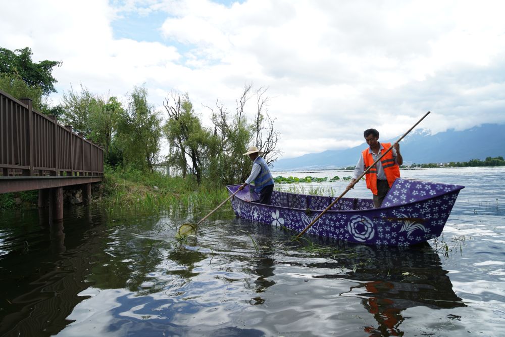 大理市灣橋鎮(zhèn)古生村位于洱海邊,是一個典型的白族傳統(tǒng)村落,已有1000多年歷史。近年來,當(dāng)?shù)刈ゾo抓實(shí)洱海生態(tài)治理,古生村也因此受益,游客數(shù)量逐漸增加,當(dāng)?shù)卮迕癯掷m(xù)增收。這是2020年9月14日,村民在大理市灣橋鎮(zhèn)古生村水域清理水草。