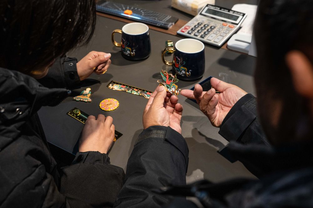2026年1月15日,云南麗江白沙壁畫博物館館長楊志堅(jiān)(右)與同事討論文創(chuàng)產(chǎn)品設(shè)計。近年來,白沙壁畫博物館持續(xù)推動白沙壁畫赴廣東、上海等地展覽,主持編纂畫冊,并推進(jìn)數(shù)字化采集和文創(chuàng)開發(fā),讓壁畫藝術(shù)以新的形式走進(jìn)人們的日常生活。