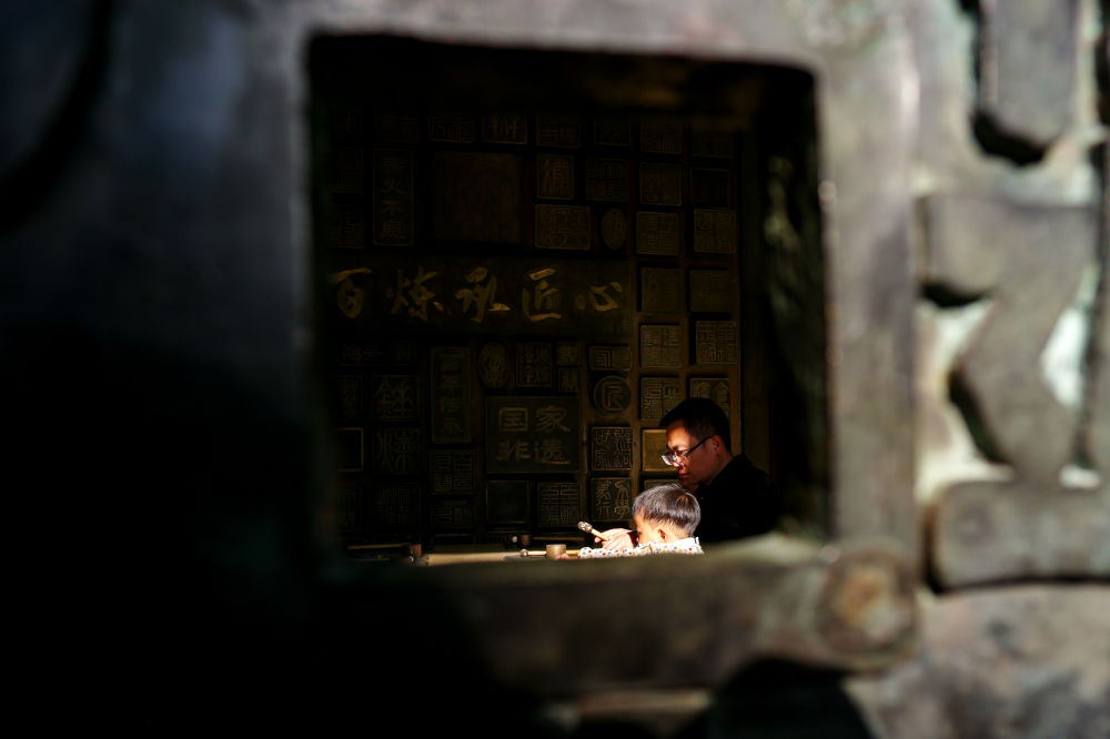 2026年3月25日,在云南曲靖會澤縣國家級非遺斑銅制作技藝傳習(xí)館,張氏斑銅第十三代傳人張偉在教兒子敲打銅器。會澤以“保護(hù)優(yōu)先、匠心修復(fù)、多元活化、融合共生”為路徑推進(jìn)古城活化保護(hù),對會館、民居等古建筑匠心修繕、活化利用,同時保留居民生活業(yè)態(tài),常態(tài)開展特色文化活動,用微改造提升古城環(huán)境。