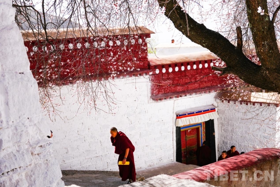 帕邦喀寺內(nèi),僧人從白墻與桃花下走過(guò),構(gòu)成春日里的別樣風(fēng)景 攝影:張藝彤
