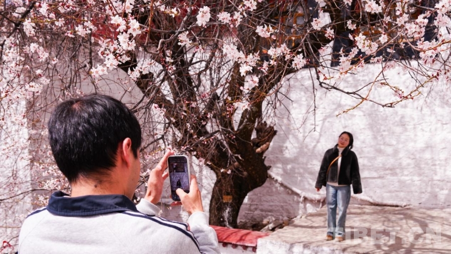 帕邦喀寺盛開(kāi)的桃花吸引游客打卡拍照 攝影:趙振宇