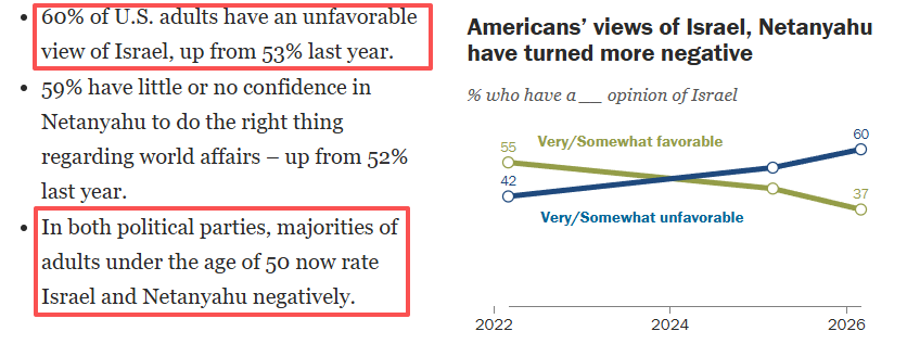 民意層面,皮尤研究中心近期的民調(diào)結(jié)果顯示,60%的美國成年人對(duì)以色列持負(fù)面看法,高于去年的53%。無論黨派歸屬,50歲以下成年人中的大多數(shù)受訪者對(duì)以色列及其總理內(nèi)塔尼亞胡的評(píng)價(jià)都是負(fù)面的。