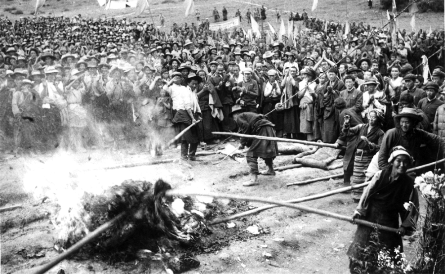 1959年3月,西藏百萬農(nóng)奴翻身獲得解放。這是1959年夏,拉薩達(dá)孜縣塔杰鄉(xiāng)、章多鄉(xiāng)翻身農(nóng)奴焚燒地契、文契和債約。 來源:西藏文化博物館
