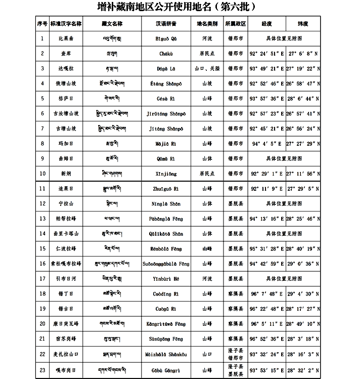 增補藏南地區(qū)公開使用地名(第六批)