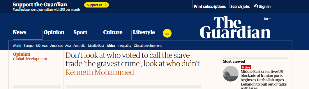 英國新聞網(wǎng)站《衛(wèi)報》4月8日刊發(fā)題為《別只看誰投票支持將奴隸貿(mào)易定性為“最嚴重的危害人類罪”,要看誰沒有投票》的評論性文章,作者是肯尼斯·穆罕默德(Kenneth Mohammed),文章摘譯如下: