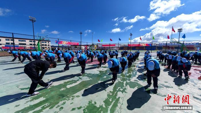 圖為活動(dòng)開(kāi)始前孩子們進(jìn)行拉伸運(yùn)動(dòng)。西藏自治區(qū)體育局 供圖