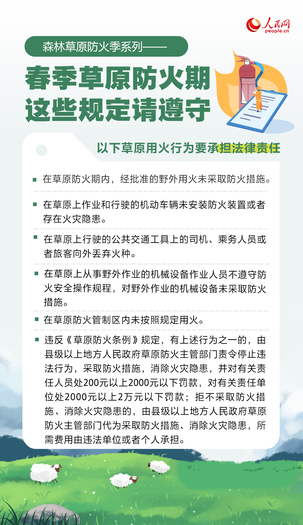 春季氣溫回升,風(fēng)干物燥,是森林草原火災(zāi)的高發(fā)期。草原防火期用火有哪些規(guī)定?哪些不當行為將承擔法律責(zé)任?一起來了解。