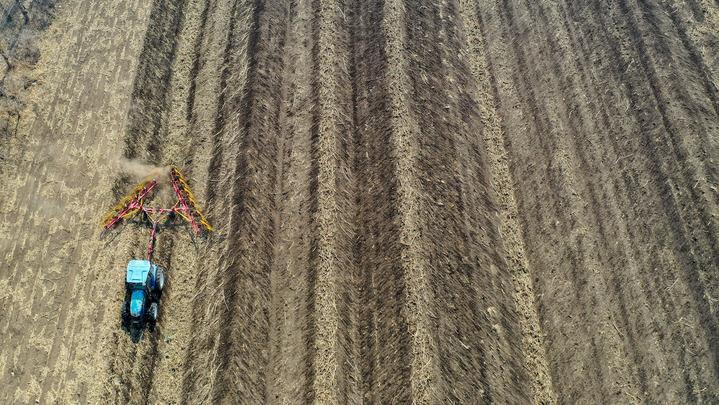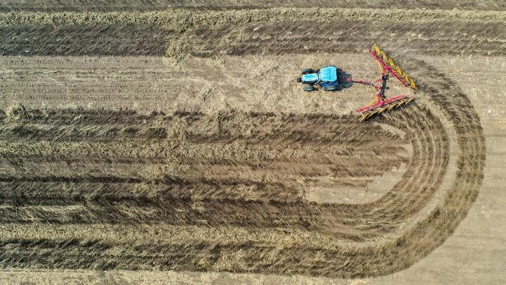 4月2日,在吉林省公主嶺市范家屯鎮(zhèn)乾程農(nóng)民專(zhuān)業(yè)合作社,農(nóng)民駕駛農(nóng)機(jī)整理耕地上的秸稈(無(wú)人機(jī)拍攝)。