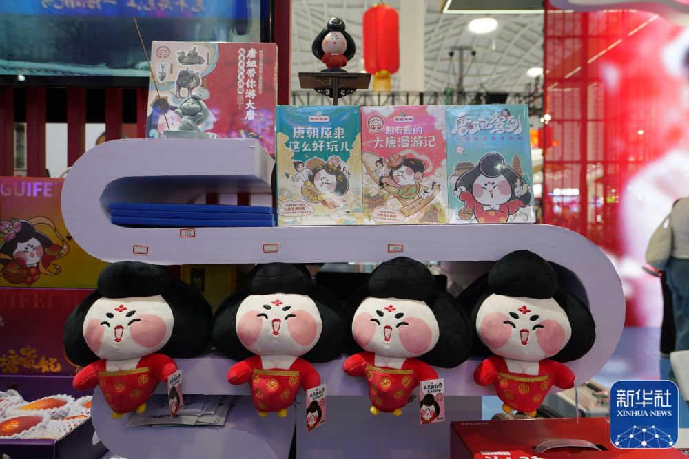 國貨特色潮品展區(qū)陜西展臺展示了“唐妞”系列文創(chuàng)產品?!疤奇ぁ钡目ㄍㄐ蜗笕〔挠陉兾鳉v史博物館館藏文物——唐代彩繪仕女俑。新華社記者楊冠宇 攝