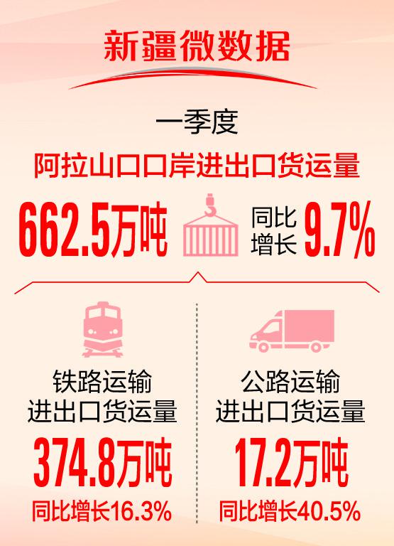 一季度,阿拉山口口岸鐵路運輸進出口貨運量374.8萬噸,同比增長16.3%;公路運輸進出口貨運量17.2萬噸,同比增長40.5%。公路、鐵路進出口貨運量均呈現(xiàn)穩(wěn)步上升的局面。