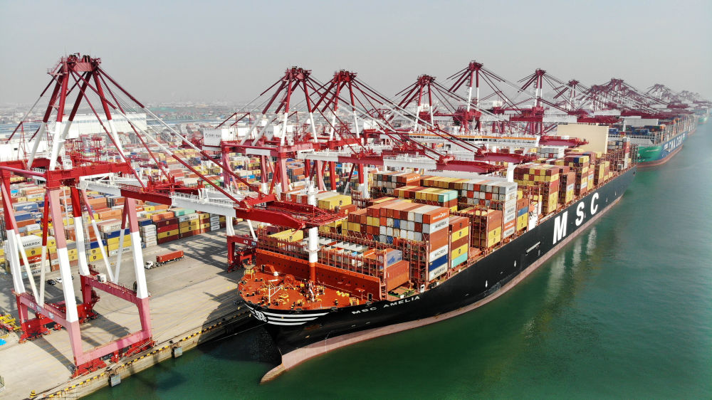 貨輪在山東港口青島港裝卸集裝箱(2024年3月13日攝,無(wú)人機(jī)照片)。新華社記者 李紫恒 攝