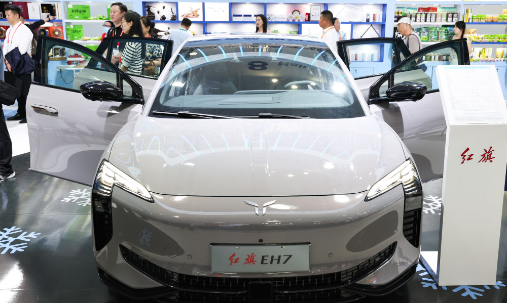 這是在第四屆中國(guó)國(guó)際消費(fèi)品博覽會(huì)上展出的紅旗新能源汽車(2024年4月13日攝)。新華社記者 楊冠宇 攝