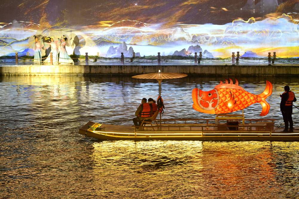 游客乘坐竹筏在湖北省宣恩縣貢水河上觀看河岸實(shí)景歌舞表演(2024年2月20日攝)。春節(jié)期間,當(dāng)?shù)亟M織豐富多彩的文化活動(dòng),吸引大批游客前來(lái)賞景游玩,為山鄉(xiāng)經(jīng)濟(jì)注入活動(dòng)。新華社發(fā)(宋文 攝)