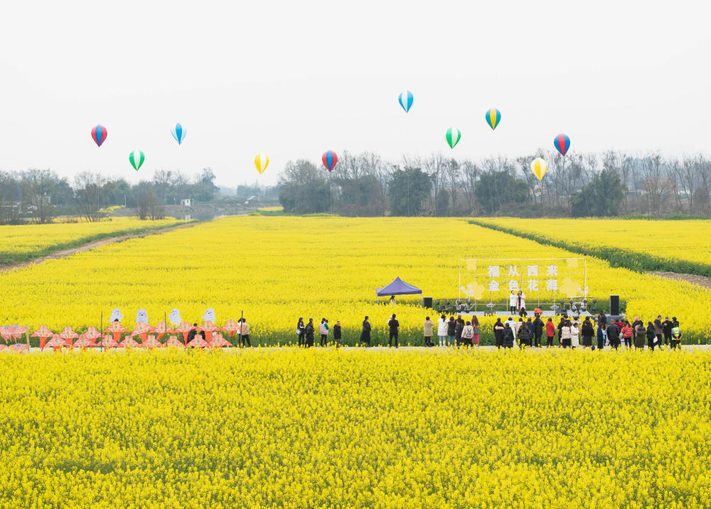 在四川省成都市蒲江縣西來(lái)鎮(zhèn)敦厚社區(qū),游客徜徉在油菜花海里(2024年3月8日攝,無(wú)人機(jī)照片)。新華社記者 江宏景 攝