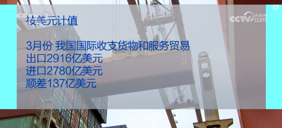 國家外匯管理局發(fā)布數(shù)據(jù),3月份,我國國際收支貨物和服務(wù)貿(mào)易進(jìn)出口規(guī)模為40430億元,同比增長3%。其中,貨物貿(mào)易出口18556億元、進(jìn)口16053億元;服務(wù)貿(mào)易出口2144億元、進(jìn)口3677億元。按美元計(jì)值,3月份,我國國際收支貨物和服務(wù)貿(mào)易出口2916億美元、進(jìn)口2780億美元、順差137億美元。