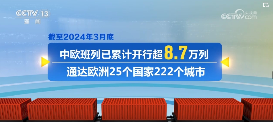 2024年一季度,中歐班列累計(jì)開行4541列、發(fā)送貨物49.3萬標(biāo)箱,同比分別增長9%、10%。截至2024年3月底,中歐班列已累計(jì)開行超8.7萬列,通達(dá)歐洲25個(gè)國家222個(gè)城市。