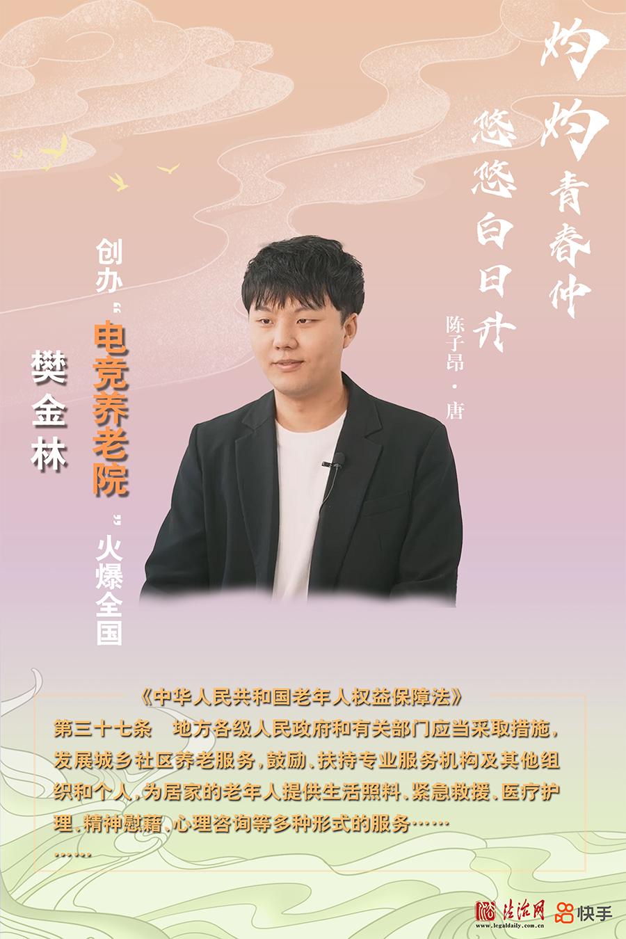 1997年出生的河南小伙樊金林(藝名:林燒)在河南省許昌市經(jīng)營了中國首個(gè)“電競養(yǎng)老院”。他把年輕人里流行的電競、蹦迪、桌游等帶進(jìn)養(yǎng)老院,還帶老人們一起拍攝短視頻,通過在社交平臺(tái)記錄他們?nèi)粘I畹狞c(diǎn)滴,讓越來越多的人了解到“原來老年生活還可以這樣有趣”。